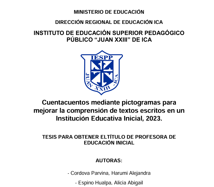 Cuentacuentos mediante pictogramas para mejorar la comprensión de textos escritos en un Institución Educativa Inicial, 2023. Cordova Parvina Harumi Alejandra, Espino Hualpa Alicia Abigail. Este estudio tiene la finalidad de determinar en qué medida los cuentacuentos mediante pictogramas mejora la comprensión de textos escritos en un Institución educativa, 2023. El tipo de investigación usado fue el aplicado. Se usó el diseño cuasiexperimental. La muestra estuvo constituida por 15 niños … |