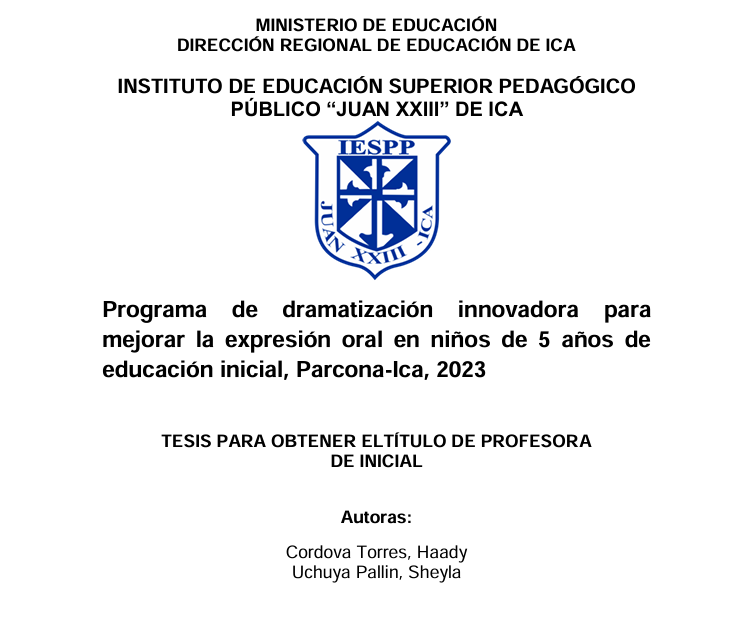 Programa de dramatización innovadora para mejorar la expresión oral en niños de 5 años de educación inicial, Parcona-Ica, 2023. Cordova Torres Haady , Uchuya Pallin Sheyla. En educción las estrategias, técnicas son necesarios para fomentar aprendizajes en los estudiantes este estudio tiene la finalidad de determinar de qué manera el programa de dramatización innovadora para mejorar la expresión oral en niños de 5 años de educación inicial, Parcona-Ica, 2023. |