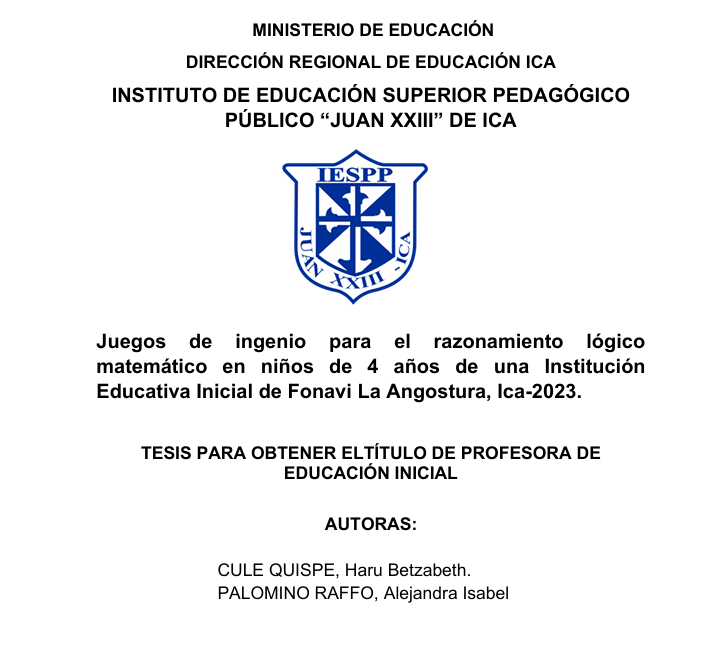 Juegos de ingenio para el razonamiento lógico matemático en niños de 4 años de una Institución Educativa Inicial de Fonavi La Angostura, Ica-2023. CULE QUISPE Haru Betzabeth, PALOMINO RAFFO Alejandra Isabel. El presente estudio tiene como propósito, explicar los efectos que produce la aplicación de juegos de ingenio en la mejora del razonamiento lógico matemático en niños de 4 años de la Institución Educativa N° 28 Fonavi La Angostura, Ica-2023. Considerando que es una investigación de tipo aplicada con diseño preexperimental, se trabajó con un grupo de 26 niños de 4 años… |