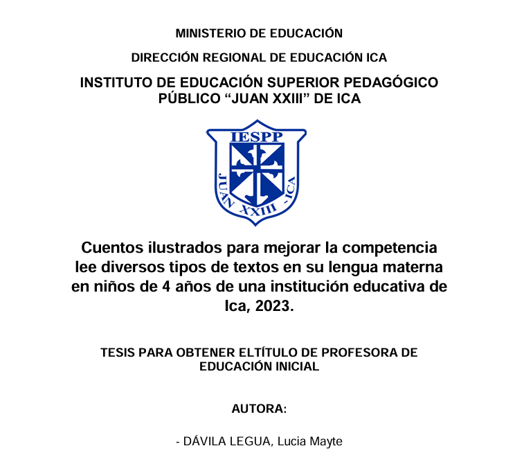 Cuentos ilustrados para mejorar la competencia lee diversos tipos de textos en su lengua materna en niños de 4 años de una institución educativa de Ica, 2023. DÁVILA LEGUA, Lucia Mayte. En el proceso temprano de adquisición de habilidades lingüísticas y de lectura, es esencial incorporar enfoques educativos que no solo capturen la atención de los niños, sino que también promuevan un amor por la lectura y el aprendizaje continuo. Esta investigación tiene como propósito, determinar en qué medida el uso de cuentos ilustrados mejora la … |