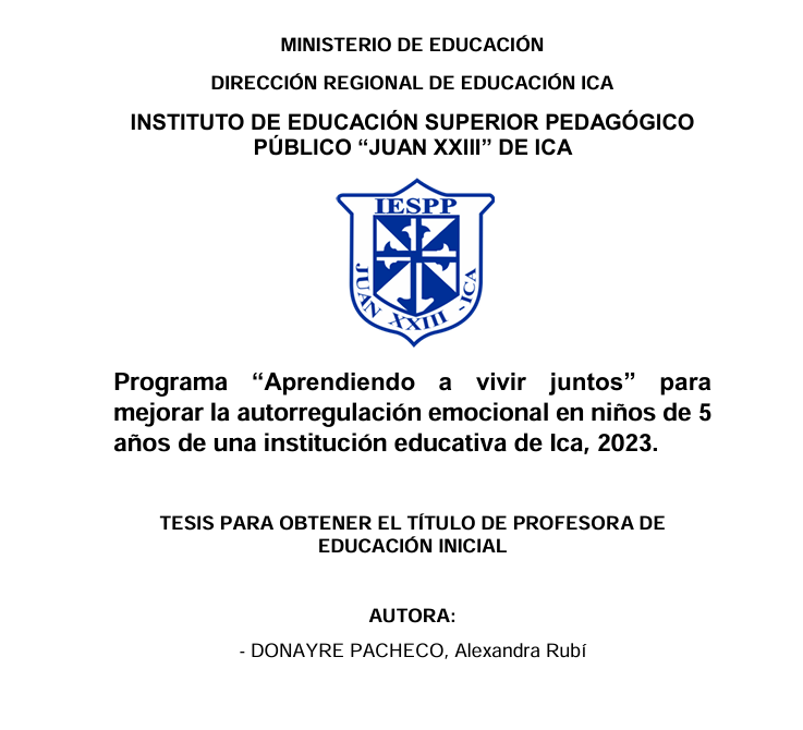 Programa “Aprendiendo a vivir juntos” para mejorar la autorregulación emocional en niños de 5 años de una institución educativa de Ica, 2023. DONAYRE PACHECO, Alexandra Rubí. El presente trabajo de investigación tiene como propósito determinar en qué medida el programa “Aprendiendo a vivir juntos” mejora la autorregulación emocional en niños de 5 años de la I.E.I. N° 34 de Pedreros- Ica, 2023. La investigación fue de tipo aplicada, para Lozada (2014) indica que este tipo de estudio tiene la finalidad de producir saberes con una ejecución directo y a mediano plazo en la población determinada … |