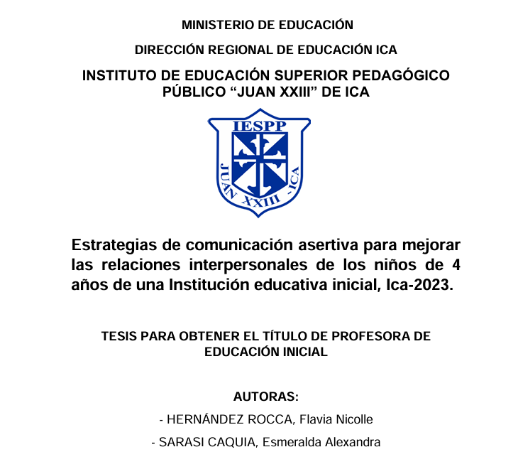 Estrategias de comunicación asertiva para mejorar las relaciones interpersonales de los niños de 4 años de una Institución educativa inicial, Ica-2023. HERNÁNDEZ ROCCA Flavia Nicolle, SARASI CAQUIA Esmeralda Alexandra. El presente trabajo de investigación tiene la finalidad de determinar de qué manera la comunicación asertiva mejora las relaciones interpersonales en los niños de 4 años de la institución educativa inicial N°36 Palazuelos-Ica, en el año 2023. Este estudio se considera desarrollar una tesis de tipo de investigación aplicada y diseño cuasiexperimental, se trabajó con un grupo de niños. |