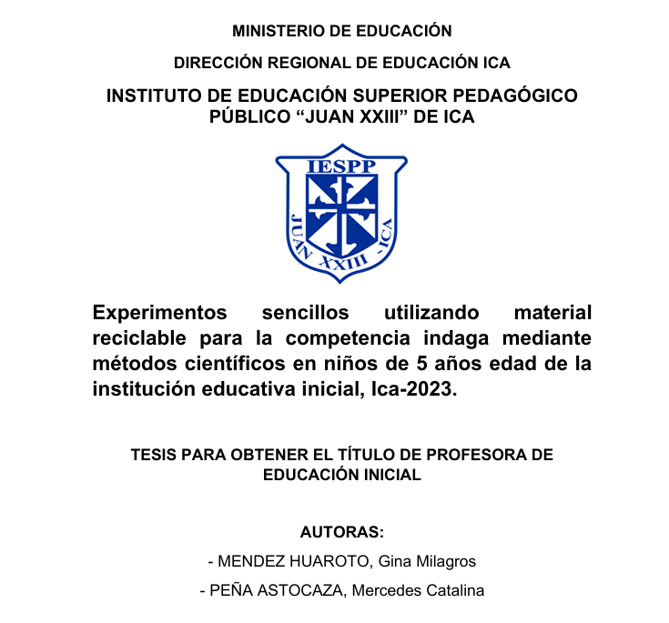 Experimentos sencillos utilizando material reciclable para la competencia indaga mediante métodos científicos en niños de 5 años edad de la institución educativa inicial, Ica-2023.MENDEZ HUAROTO Gina Milagros, PEÑA ASTOCAZA Mercedes Catalina. Al utilizar materiales reciclables, se fomenta la conciencia medioambiental y se promueve la importancia de la reutilización y el reciclaje. Asimismo, estos experimentos ofrecen una oportunidad valiosa para aprender conceptos científicos de una manera práctica y aplicada, lo que fortalece la comprensión de los principios científicos. Este estudio tiene el objetivo . . . |