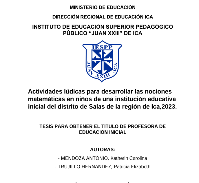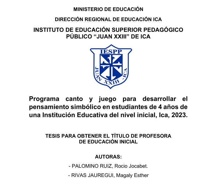 Programa canto y juego para desarrollar el pensamiento simbólico en estudiantes de 4 años de una Institución Educativa del nivel inicial, Ica, 2023. PALOMINO RUIZ Rocio Jocabet, RIVAS JAUREGUI Magaly Esther. Este trabajo de investigación tiene la finalidad de determinar en qué medida el programa canto y juego desarrolla pensamiento simbólico en estudiantes de 4 años de la Institución Educativa N°22, del Pueblo Joven “Señor de Luren”- Ica, 2023. La metodología fue cuantitativa. Esta tesis fue de tipo aplicada. El diseño que usó el estudio fue el cuasiexperimental. La población lo conformaron 74 estudiantes … |