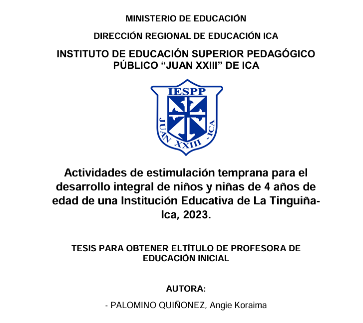 Actividades de estimulación temprana para el desarrollo integral de niños y niñas de 4 años de edad de una Institución Educativa de La Tinguiña Ica, 2023. PALOMINO QUIÑONEZ, Angie Koraima. Las actividades de estimulación temprana son fundamentales para el desarrollo integral de los niños. Estas actividades están diseñadas para promover y potenciar las habilidades físicas, cognitivas, emocionales y sociales desde los primeros años de vida. Por ello, la presente investigación surge con el propósito de establecer de qué manera las actividades de estimulación temprana mejora … |