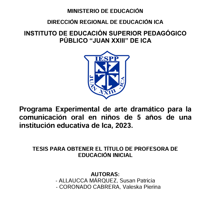 Programa Experimental de arte dramático para la comunicación oral en niños de 5 años de una institución educativa de Ica, 2023. ALLAUCCA MÁRQUEZ Susan Patricia, CORONADO CABRERA Valeska Pierina. El arte dramático, como herramienta pedagógica, se erige como un vehículo creativo y enriquecedor para el desarrollo integral de los niños. En este trabajo de investigación tiene la finalidad de analizar de qué manera el programa experimental de arte dramático mejora la comunicación oral en niños de 5 años de la institución educativa N° 5 de Ica, 2023. |