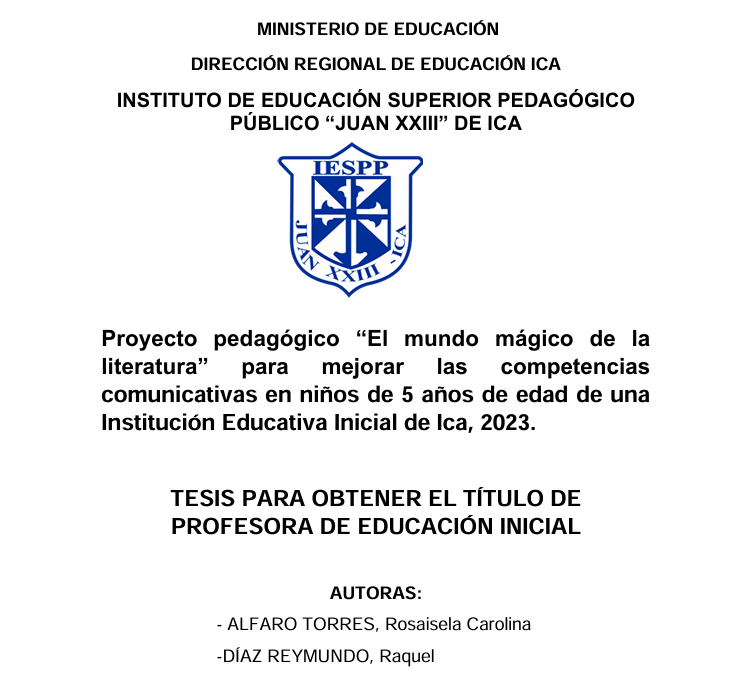 Proyecto pedagógico “El mundo mágico de la literatura” para mejorar las competencias comunicativas en niños de 5 años de edad de una Institución Educativa Inicial de Ica, 2023. ALFARO TORRES Rosaisela Carolina, DÍAZ REYMUNDO Raquel. El presente estudio tiene por finalidad determinar de qué manera el Proyecto pedagógico “El mundo mágico de la literatura” mejora las competencias comunicativas en niños de 5 años de edad de la Institución Educativa Inicial N°81 “San Jorge” de Parcona Ica- 2023. Con respecto a la metodología desarrollada en esta investigación corresponde a un estudio aplicado porque busca resolver el problema educativo … |