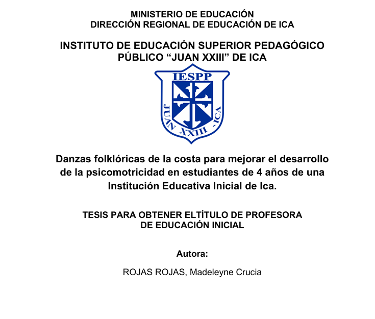 Ritmos musicales infantiles para desarrollar la coordinación sensorio motriz en niños de 3 años de edad de una institución educativa, Ica-2023. ROJAS CHUIMA Jhadira Beatriz, VERA FUENTES Dayana Nicole. El presente estudio tiene por finalidad determinar de qué manera los ritmos musicales infantiles desarrollan la coordinación sensoriomotriz en niños de 3 años de la Institución Educativa Inicial N°24 “San Idelfonso” del distrito de la Tinguiña, Ica -2023. La investigación trabajo con una metodología de tipo aplicada con diseño preexperimental con una población muestral de 20 niños de 3 años de la Institución Educativa Inicial N°24 “San Idelfonso” elegido mediante … |