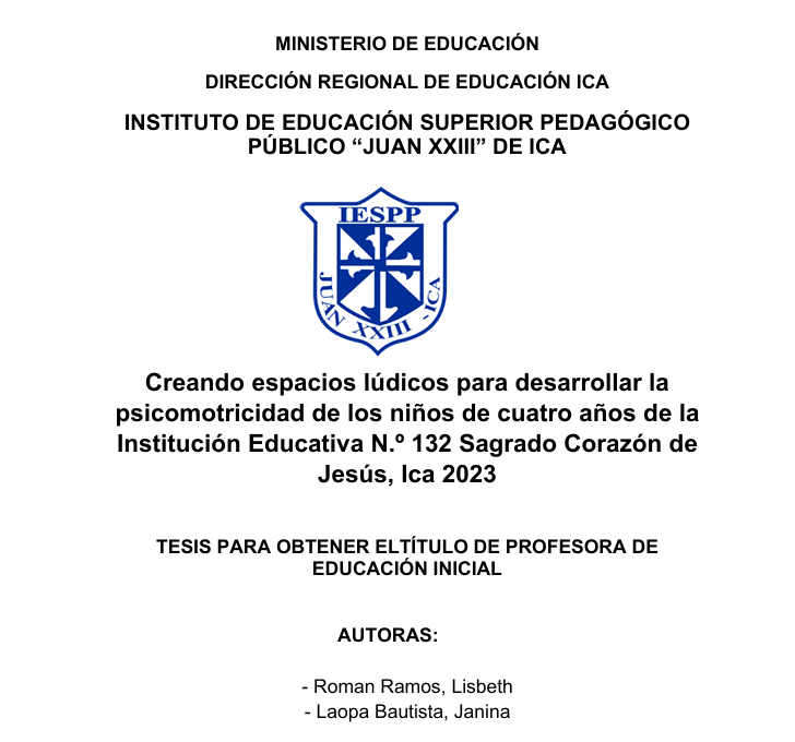 Creando espacios lúdicos para desarrollar la psicomotricidad de los niños de cuatro años de la Institución Educativa N.º 132 Sagrado Corazón de Jesús, Ica 2023. Roman Ramos Lisbeth, Laopa Bautista Janina. Este trabajo de investigación tiene la finalidad de determinar en qué media creando espacios lúdicos desarrolla la psicomotricidad de los niños de cuatro años de la Institución Educativa N.º 132 Sagrado Corazón de Jesús, Ica 2023. La metodología fue cuantitativa de tipo aplicada. Asimismo, fue una investigación explicativa. Esta investigación tuvo un diseño pre experimental. La población y la muestra quedó compuesta por 21 niños … |