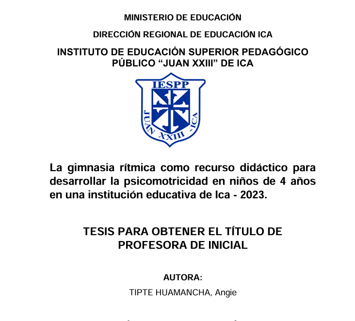 La gimnasia rítmica como recurso didáctico para desarrollar la psicomotricidad en niños de 4 años en una institución educativa de Ica – 2023. TIPTE HUAMANCHA, Angie. La gimnasia rítmica es una disciplina deportiva que fusiona elementos de la danza, expresión artística y la destreza física en la que se valora la gracia, precisión, fuerza y flexibilidad. La presente investigación tiene como propósito determinar los efectos que produce la gimnasia rítmica como recurso didáctico en el desarrollo de la psicomotricidad en niños de 4 años de la Institución … |