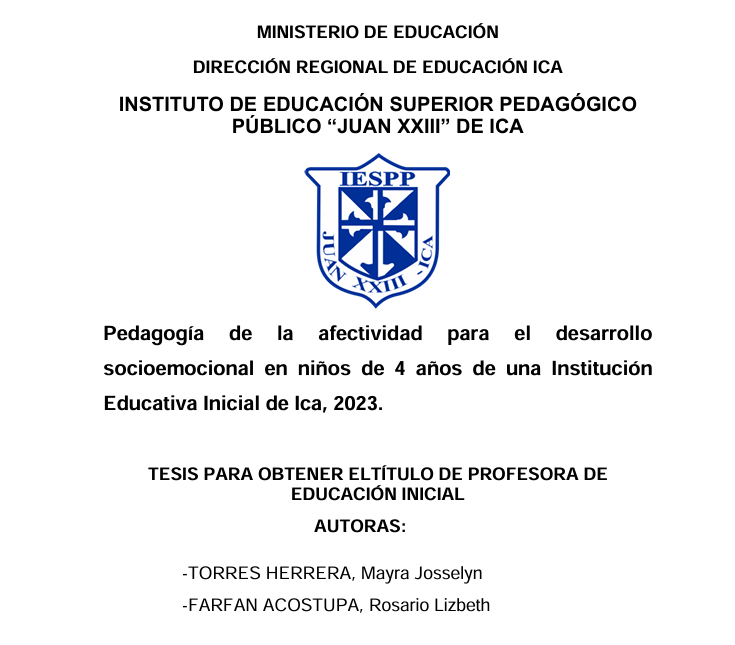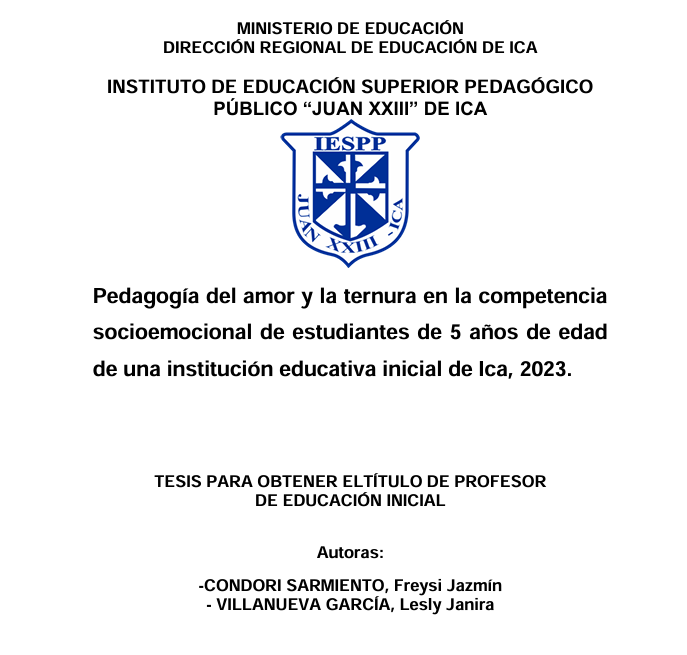 Pedagogía del amor y la ternura en la competencia socioemocional de estudiantes de 5 años de edad de una institución educativa inicial de Ica, 2023. CONDORI SARMIENTO Freysi Jazmín, VILLANUEVA GARCÍA Lesly Janira. El presente trabajo de investigación tiene por finalidad determinar en qué medida la pedagogía del amor y la ternura como estrategia didáctica mejora la competencia socioemocional en niños de 5 años de una institución educativa inicial de Ica, 2023. |