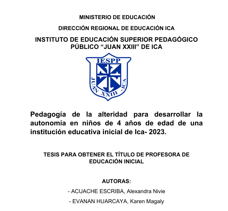Pedagogía de la alteridad para desarrollar la autonomía en niños de 4 años de edad de una institución educativa inicial de Ica- 2023. ACUACHE ESCRIBA Alexandra Nivie, EVANAN HUARCAYA Karen Magaly. La pedagogía de la alteridad, centrada en el reconocimiento y la valoración de la diversidad individual, emerge como un enfoque educativo innovador y crucial en el contexto del desarrollo infantil. El objetivo principal determinar en qué medida la pedagogía de la alteridad desarrolla la autonomía en niños de 4 años de edad de la institución educativa inicial de Ica, 2023. |