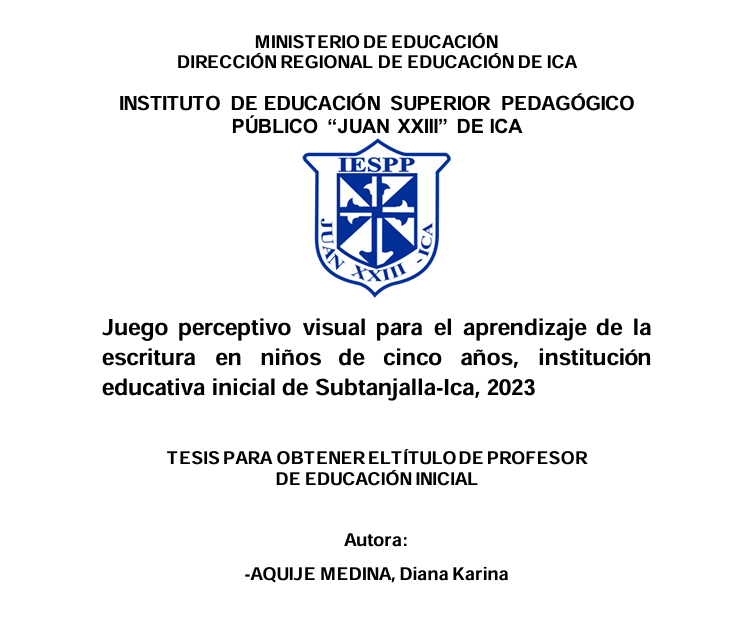 Juego perceptivo visual para el aprendizaje de la escritura en niños de cinco años, institución educativa inicial de Subtanjalla-Ica, 2023. AQUIJE MEDINA, Diana Karina. Este estudio tiene la finalidad de determinar en qué medida el juego perceptivo visual mejora el aprendizaje de la escritura en niños de cinco años, institución educativa inicial de Subtanjalla-Ica, 2023. Este trabajo de investigación se realizó con una metodología cuantitativa. El tipo de investigación usado fue el aplicado. Se usó el diseño pre-experimental. |
