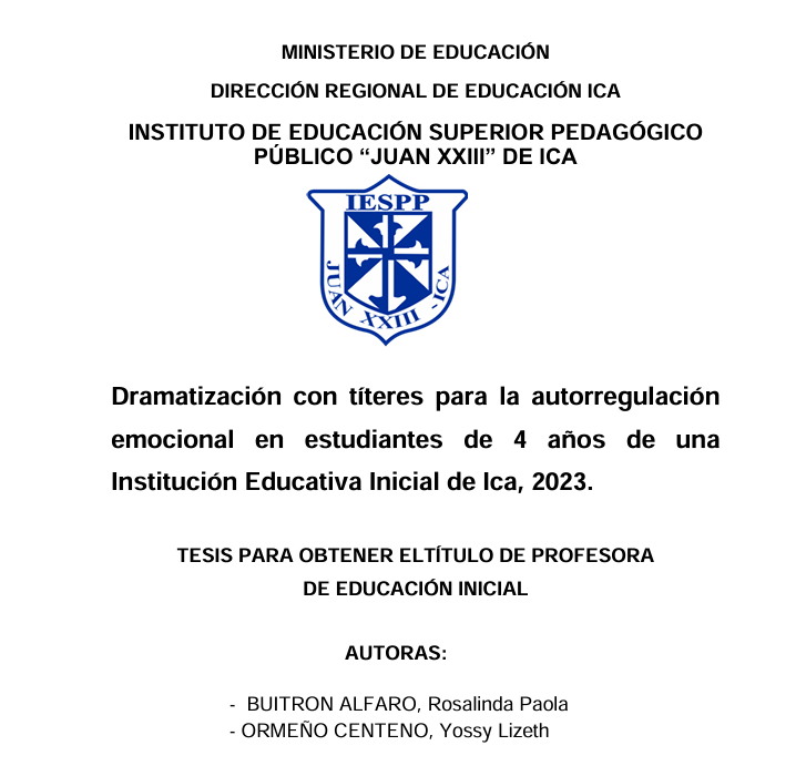 Dramatización con títeres para la autorregulación emocional en estudiantes de 4 años de una Institución Educativa Inicial de Ica, 2023. BUITRON ALFARO Rosalinda Paola, ORMEÑO CENTENO Yossy Lizeth. El presente estudio tiene como propósito determinar de qué manera la dramatización con títeres mejora la autorregulación emocional en estudiantes de 4 años de la Institución Educativa N°01 “San Joaquín” de Ica, 2023. Este estudio por su finalidad es de tipo aplicada ya que busca resolver un problema educativo relacionado con el desarrollo de la autorregulación emocional, asimismo se trabajó … |
