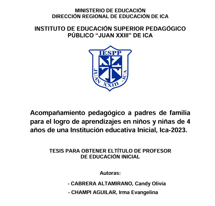 Acompañamiento pedagógico a padres de familia para el logro de aprendizajes en niños y niñas de 4 años de una Institución educativa Inicial, Ica-2023. CABRERA ALTAMIRANO Candy Olivia, CHAMPI AGUILAR Irma Evangelina. Este trabajo de investigación tiene la finalidad de determinar de qué manera el acompañamiento pedagógico a padres de familia mejora el logro de aprendizajes en niños de 4 años de una Institución educativa Inicial, Ica-2023. Este estudio considera la metodología cuantitativa de tipo aplicado, Se usó el diseño preexperimental. La población quedó compuesta por 50 niños y niñas de 4 años de una Institución … |