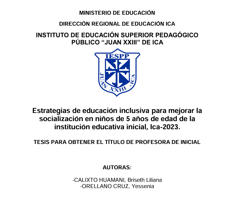 Estrategias de educación inclusiva para mejorar la socialización en niños de 5 años de edad de la institución educativa inicial, Ica-2023. CALIXTO HUAMANI Briseth Liliana , ORELLANO CRUZ Yessenia. Este estudio tiene la finalidad de determinar en qué medida las estrategias de educación inclusiva mejora la socialización en niños de 5 años de edad de la institución educativa inicial, Ica-2023. |