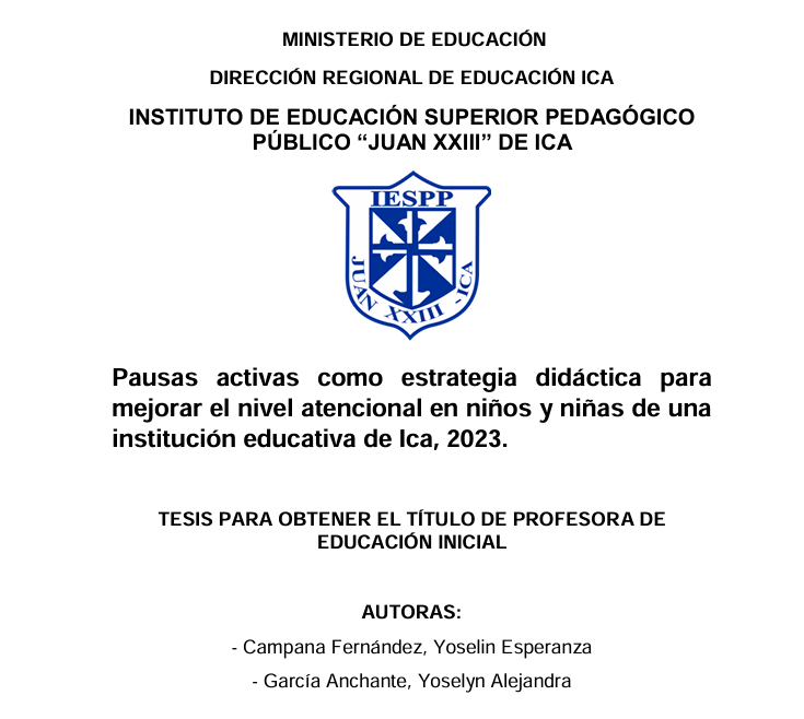 Pausas activas como estrategia didáctica para mejorar el nivel atencional en niños y niñas de una institución educativa de Ica, 2023. Campana Fernández Yoselin Esperanza, García Anchante Yoselyn Alejandra. En el contexto educativo, la atención es un elemento fundamental para el proceso de aprendizaje y desarrollo de habilidades cognitivas en los niños. La capacidad de mantener un nivel atencional adecuado no solo influye en el rendimiento académico, sino que también impacta su bienestar emocional y social. Este estudio tiene el objetivo de determinar … |
